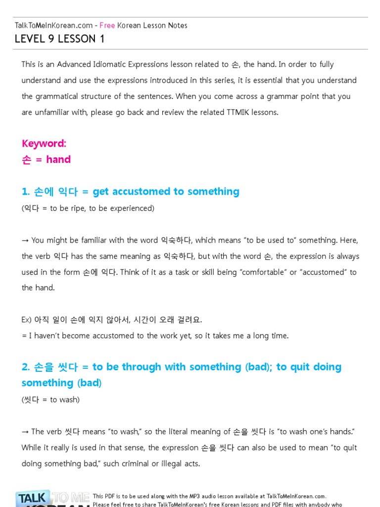 This PDF workbook has been built to help you reinforce what you have learned from the first ten lessons Lesson 1 - Lesson 10 of Level 1 at TalkToMeInKorean. Advanced Idiomatic Expressions 12 얼굴 Face Lesson 2. 3 Learn Korean Hangul Alphabet in 1 Hour PDF.